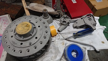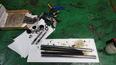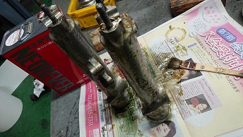 さぁーZ1のフォークを分解し、ボトムなどのクリアを剥ぎ研磨準備進めるのと、塗装準備するので、ブラスト作業も進めていきます。