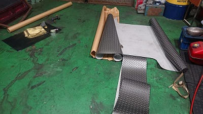 この後、ハイエースの床張りを進めているところに、いつも早く来る、コニー&まぁー君登場。。。