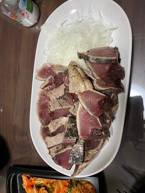 夜は、買ったカツオたたきをいただきましたよ!